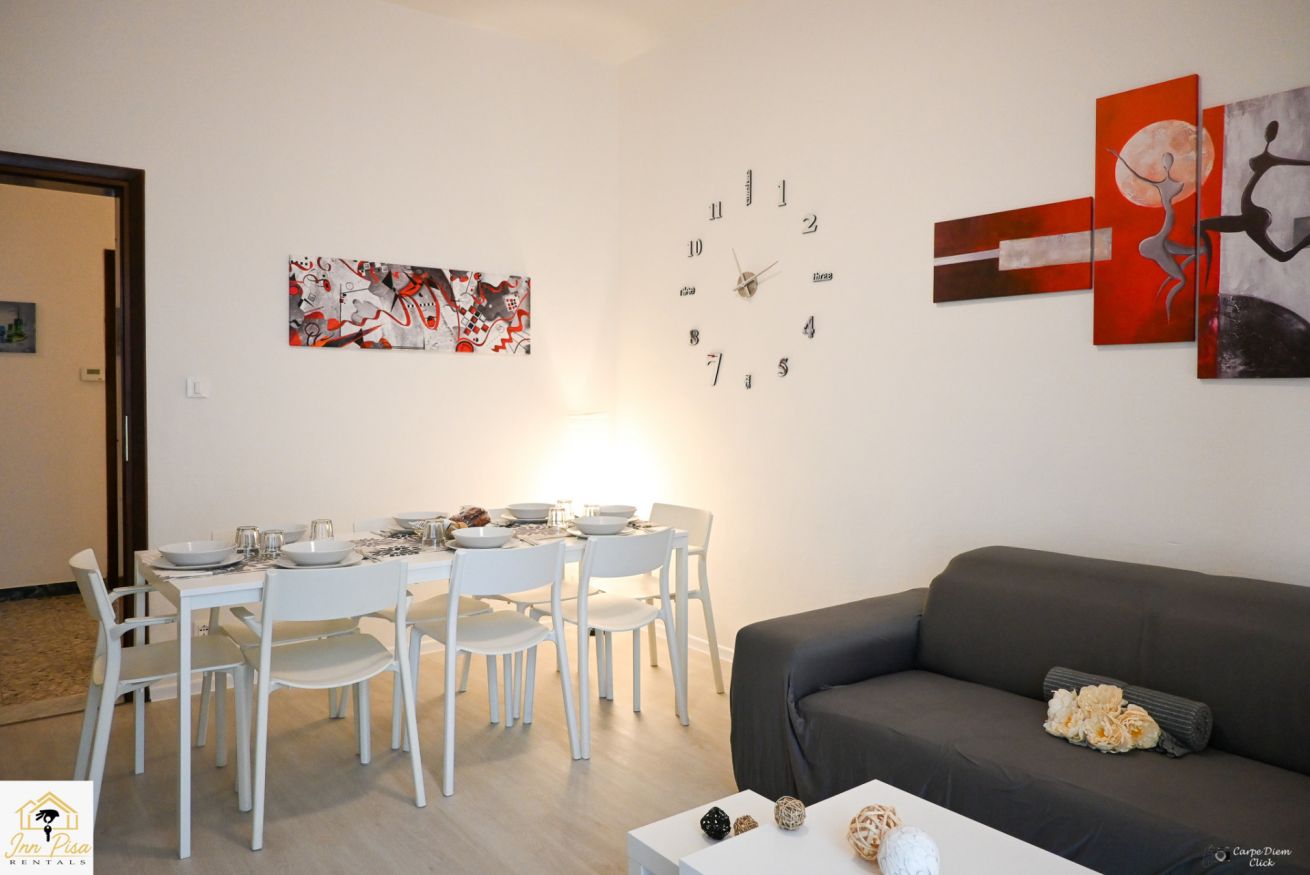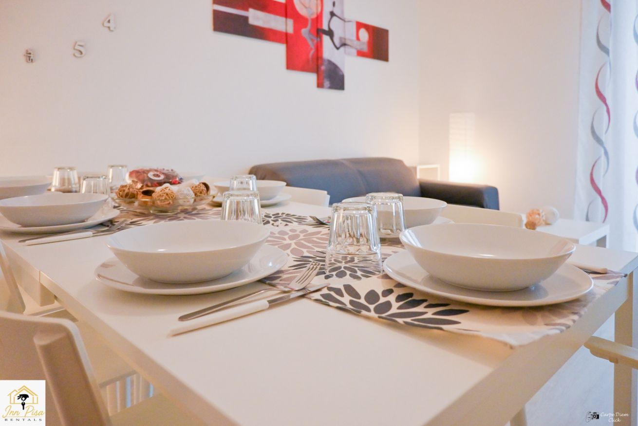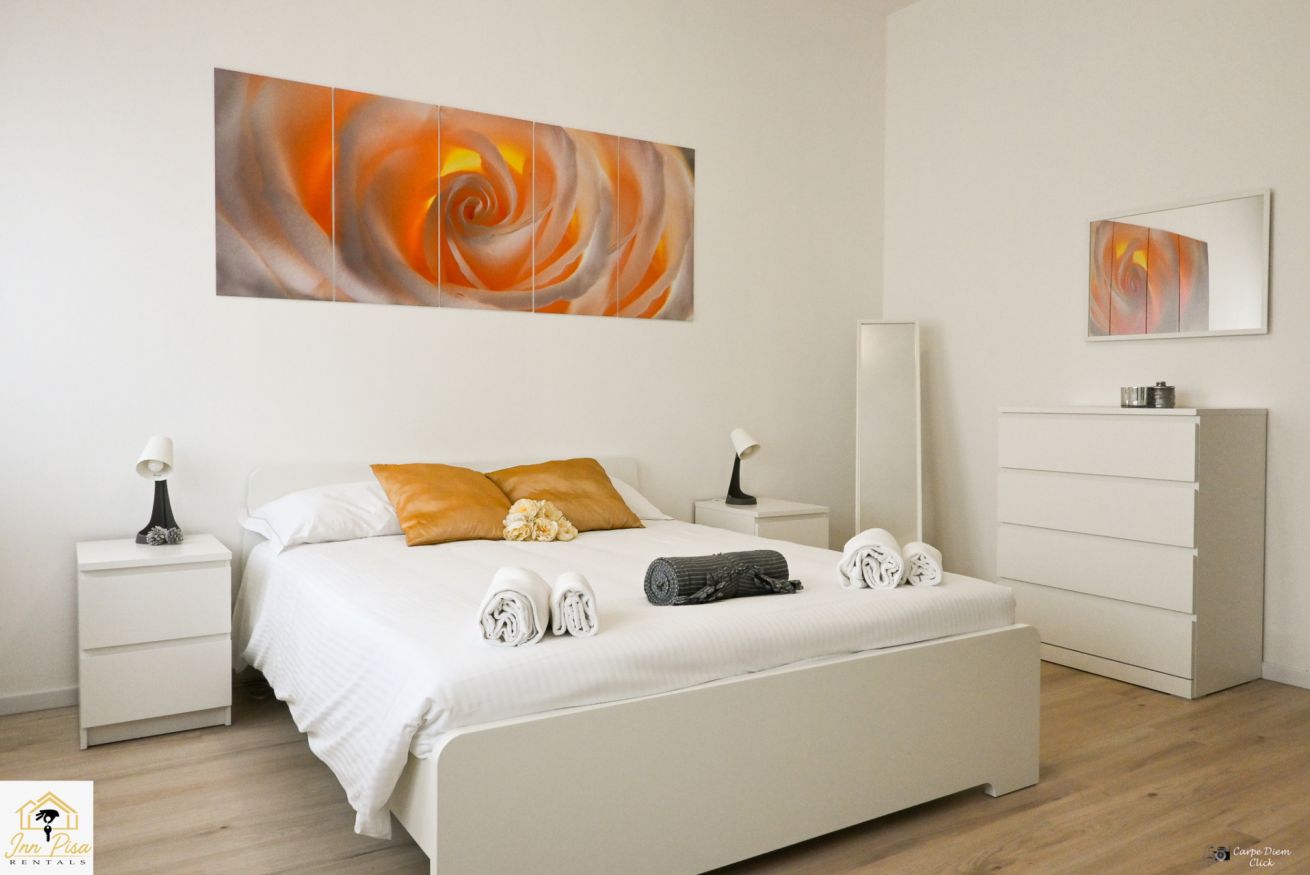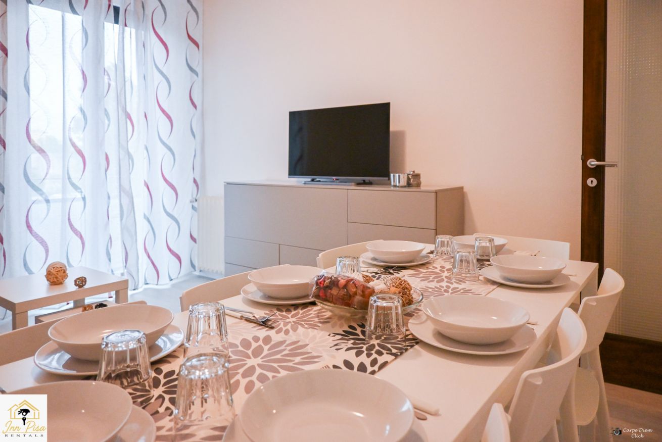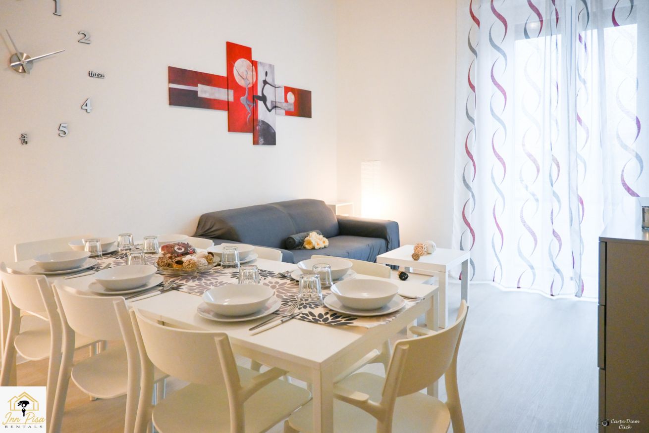 Inn Pisa Rentals - The Modern City Flat si trova a due passi dall'aeroporto di Pisa e dalla stazione dei treni.Molto vicino a tutte le principali attrazioni turistiche della città è ampio e molto luminoso,arredato con gusto in stile moderno e ricco di particolari che lo rendono davvero gradevole e confortevole.Posto al 1 piano senza ascensore,può ospitare fino a 8 persone. Si compone di ingresso, soggiorno con divano,cucina abitabile completamente attrezzata,4 camere matrimoniali,2 bagni,2 terrazzi attrezzati,WIFI