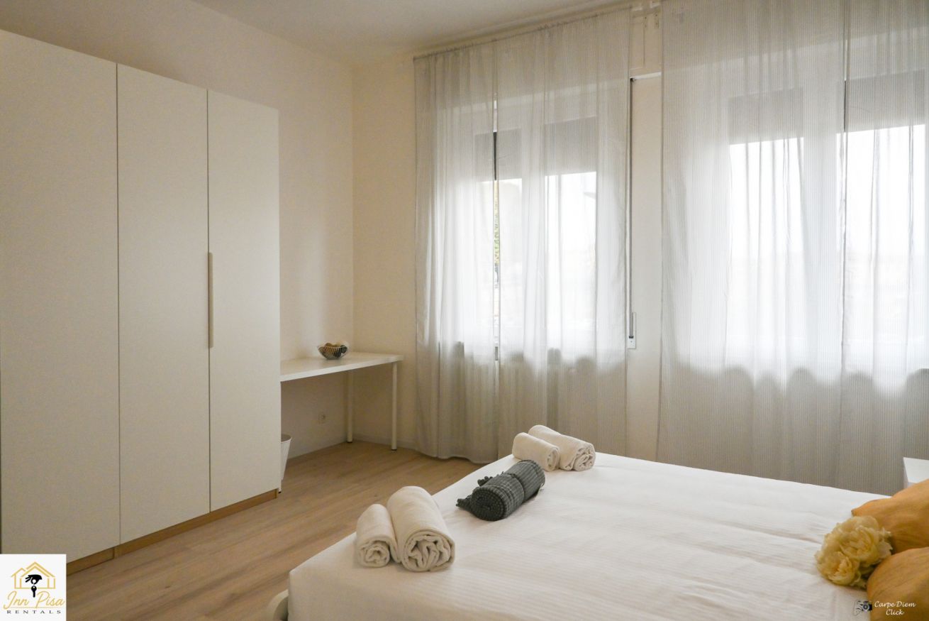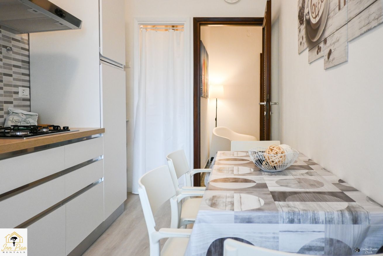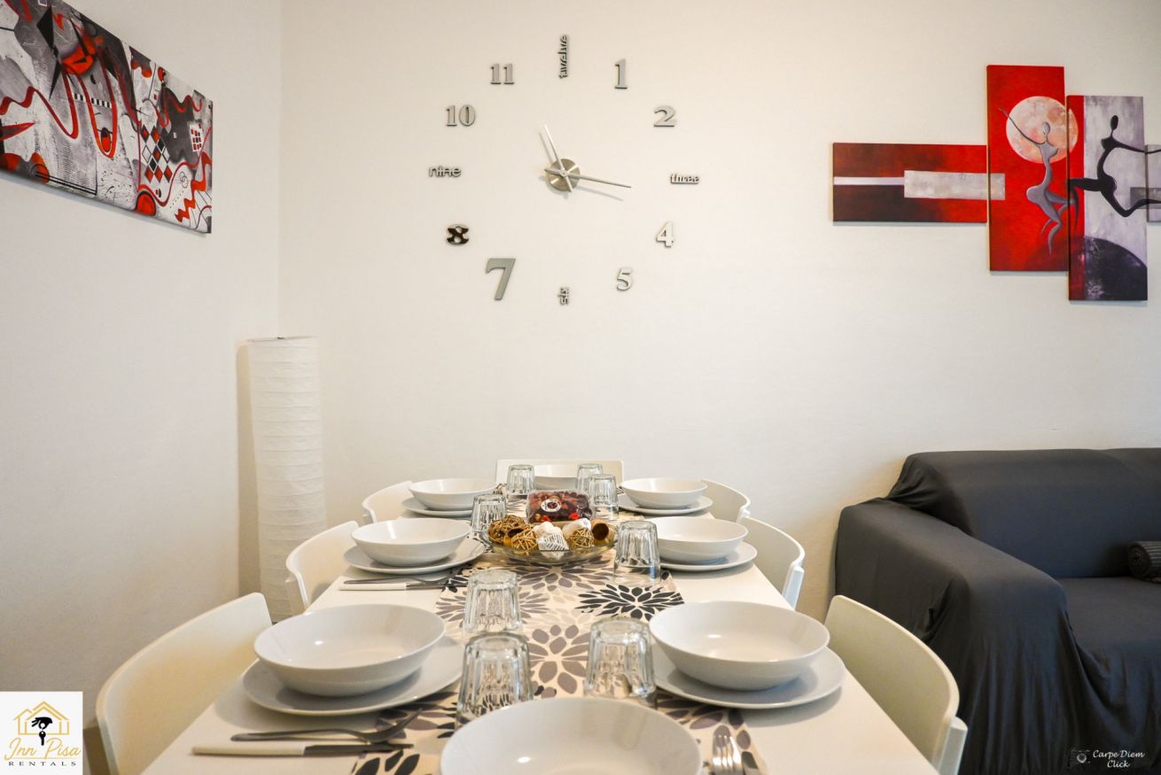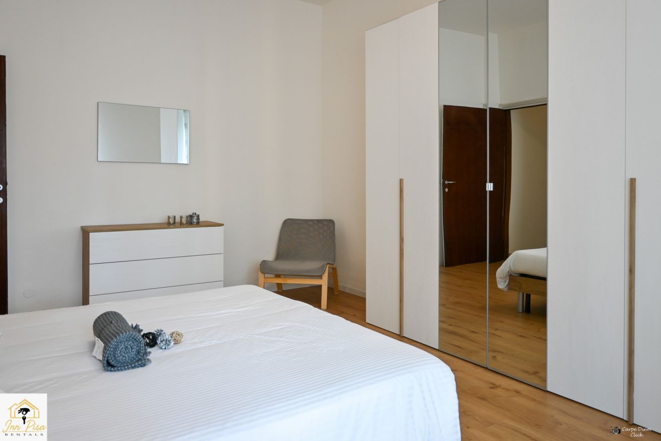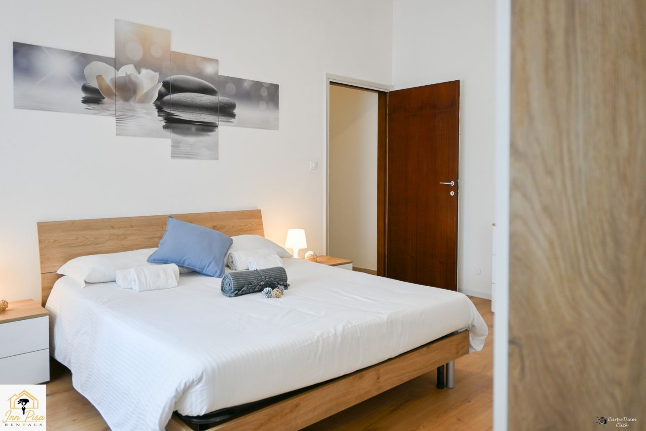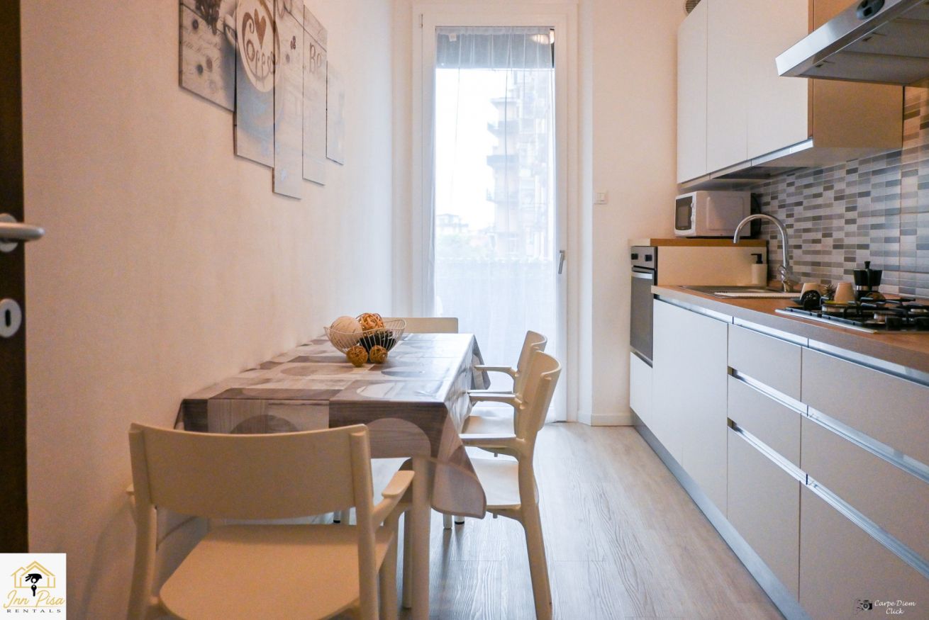 Inn Pisa Rentals - The Modern City Flat si trova a due passi dall'aeroporto di Pisa e dalla stazione dei treni.Molto vicino a tutte le principali attrazioni turistiche della città è ampio e molto luminoso,arredato con gusto in stile moderno e ricco di particolari che lo rendono davvero gradevole e confortevole.Posto al 1 piano senza ascensore,può ospitare fino a 8 persone. Si compone di ingresso, soggiorno con divano,cucina abitabile completamente attrezzata,4 camere matrimoniali,2 bagni,2 terrazzi attrezzati,WIFI